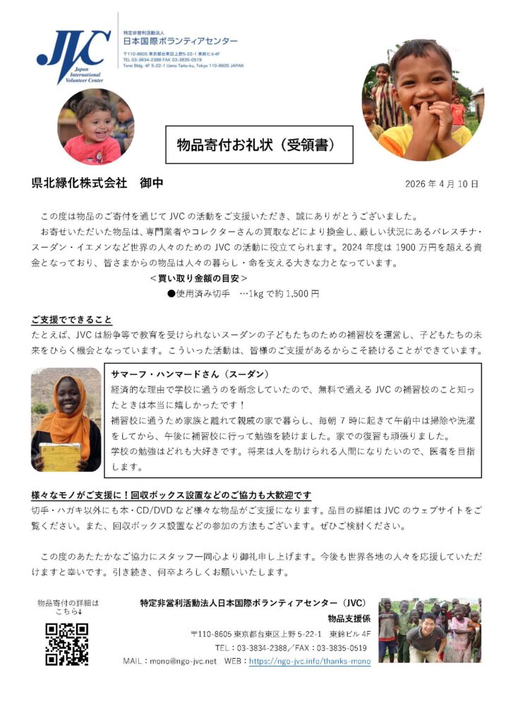 この度、弊社は、認定NPO法人 日本国際ボランティアセンター(JVC)の物品寄付活動に協力し、使用済み切手を寄付いたしました。